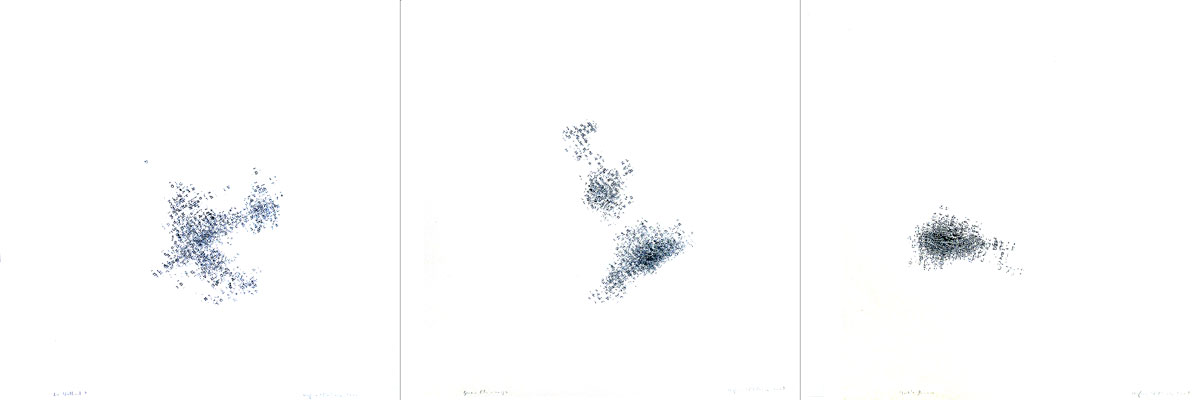 teflon mounted on museum board with soundtrack, three panels, 13.25 x 13.25 inches each